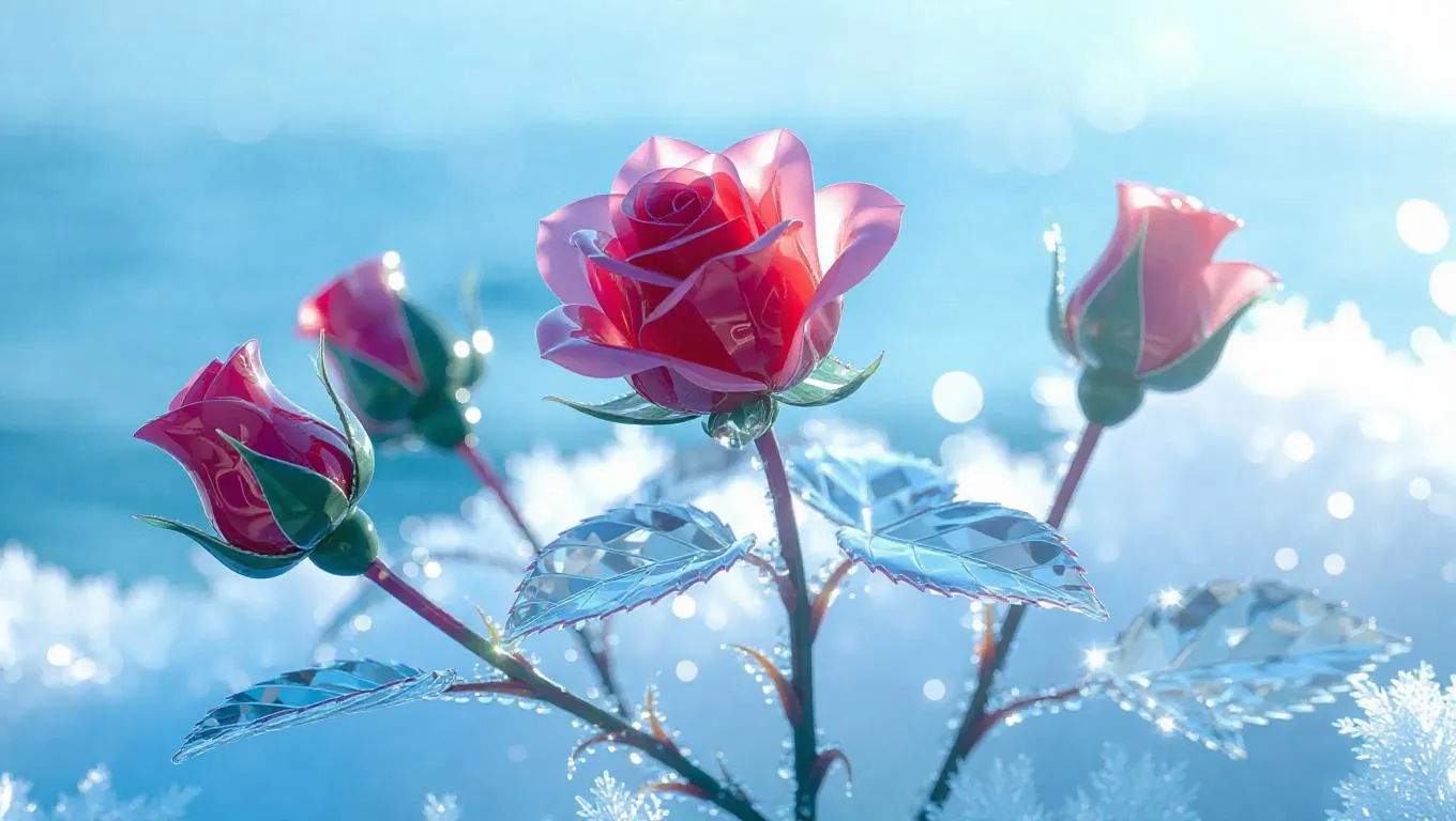 A frozen rose bush, each bloom crafted from glassy crystal, sparkling brilliantly in the sunlight, surrounded by a frosty mist that adds an ethereal glow, set against a backdrop of shimmering waters and a bright blue sky