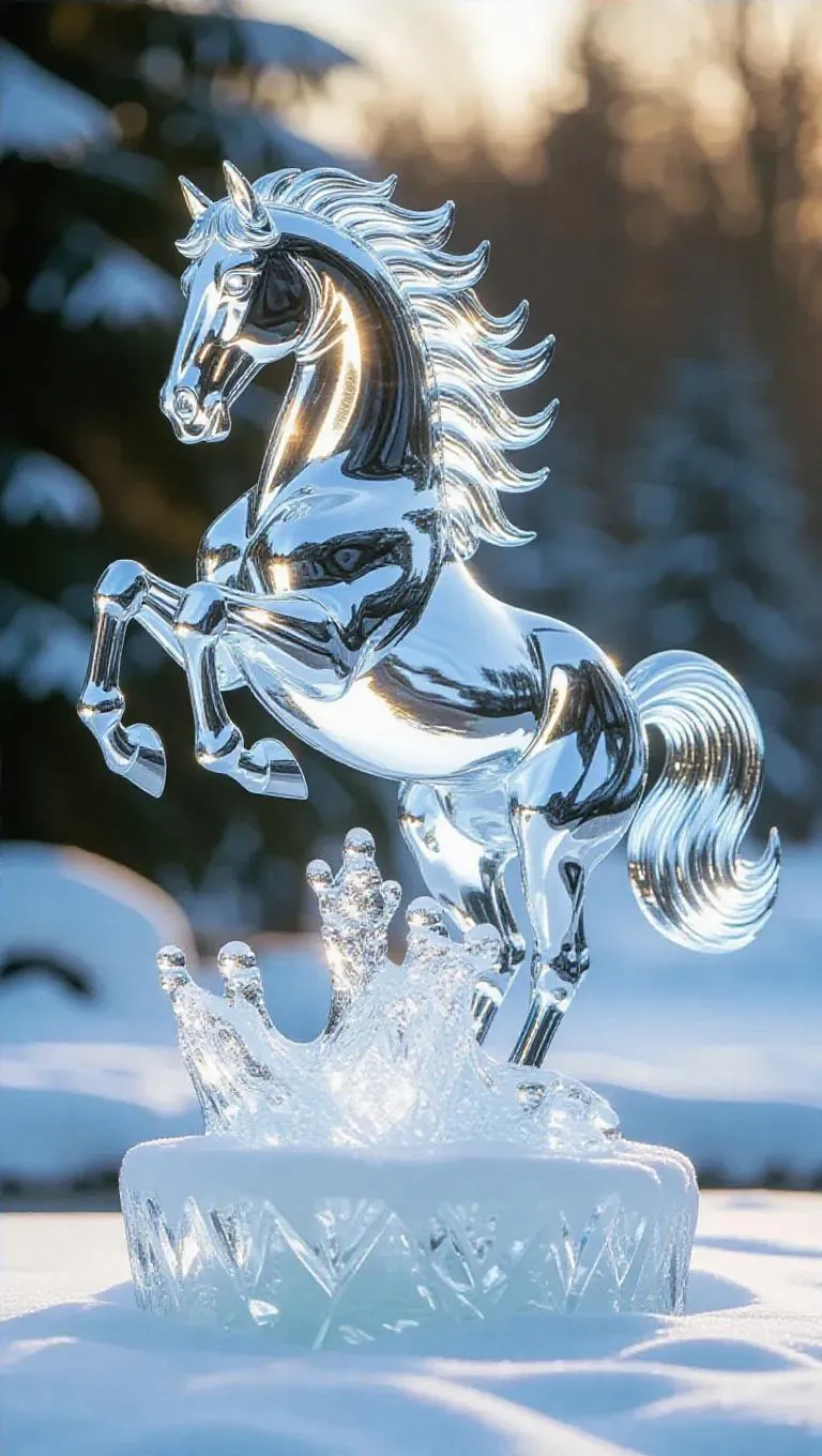 A majestic frozen fountain shaped like a horse, water suspended mid-motion in clear crystal curves, surrounded by a blanket of snow, with soft, diffused light casting a magical glow, emphasizing the intricate ice formations