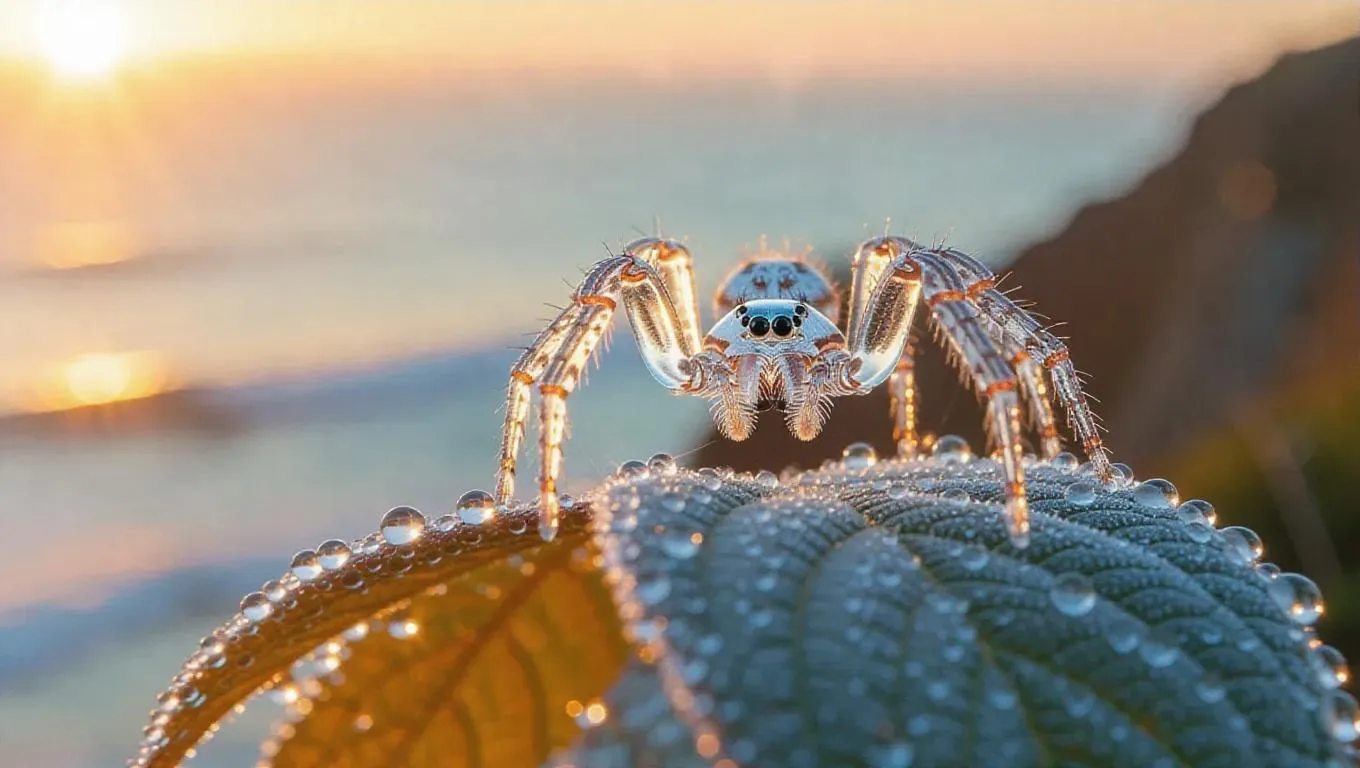 A delicate crystal spider perched on a frosted leaf, legs crafted from transparent ice with intricate, shimmering patterns, glowing softly in the gentle morning light, surrounded by dewdrops that sparkle like diamonds on a cliff overlooking the ocean.