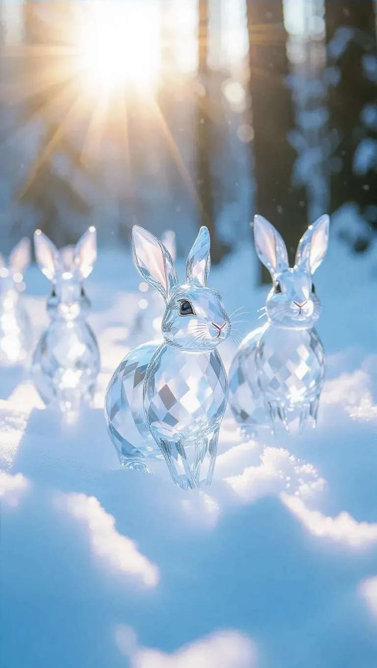 A group of ethereal crystal rabbits gracefully walking through a serene snowy glade, their translucent bodies shimmering as they catch the soft rays of the morning sun, creating a magical and frosty ambiance.