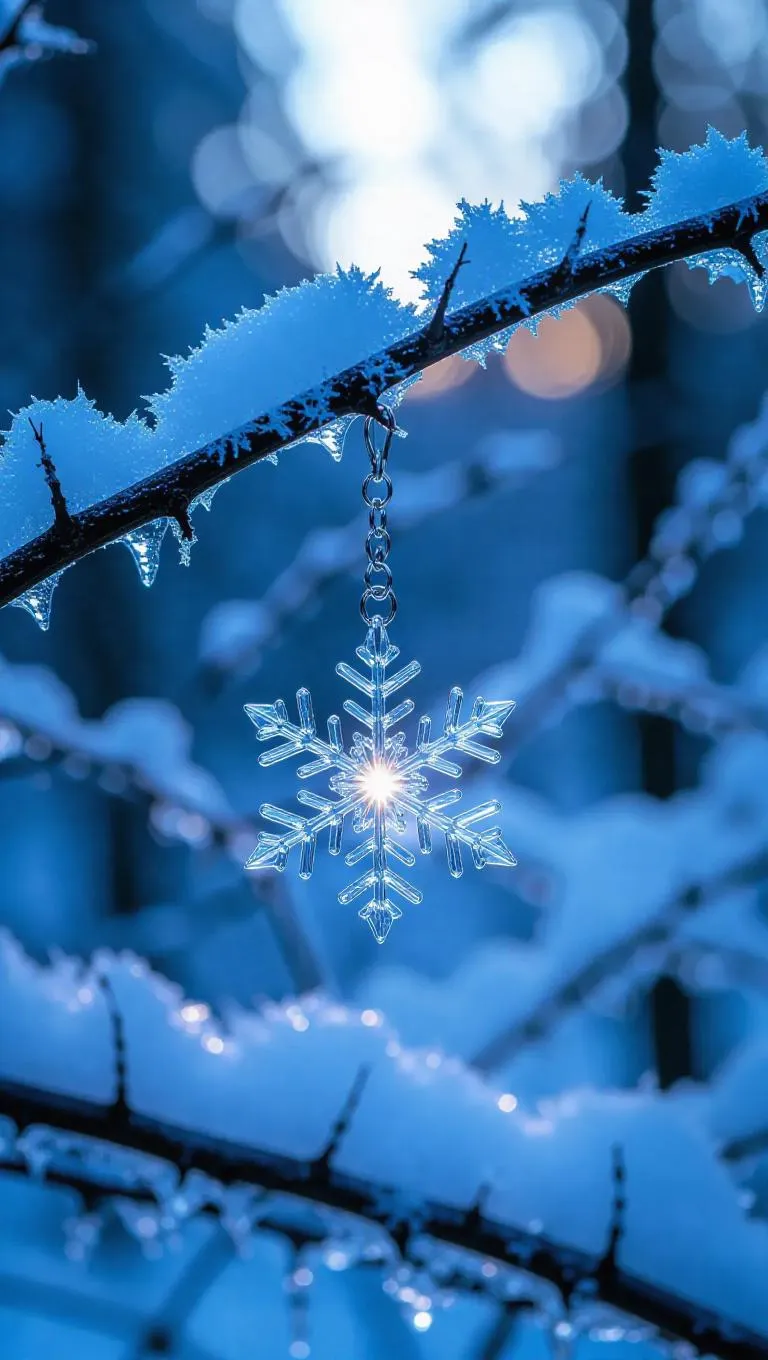 A snowflake-shaped crystal pendant, resting delicately on the frost-covered branches of a winter forest at twilight, glowing faintly with an ethereal inner light, casting soft, shimmering reflections on the icy twigs, surrounded by a serene, snowy woodland.