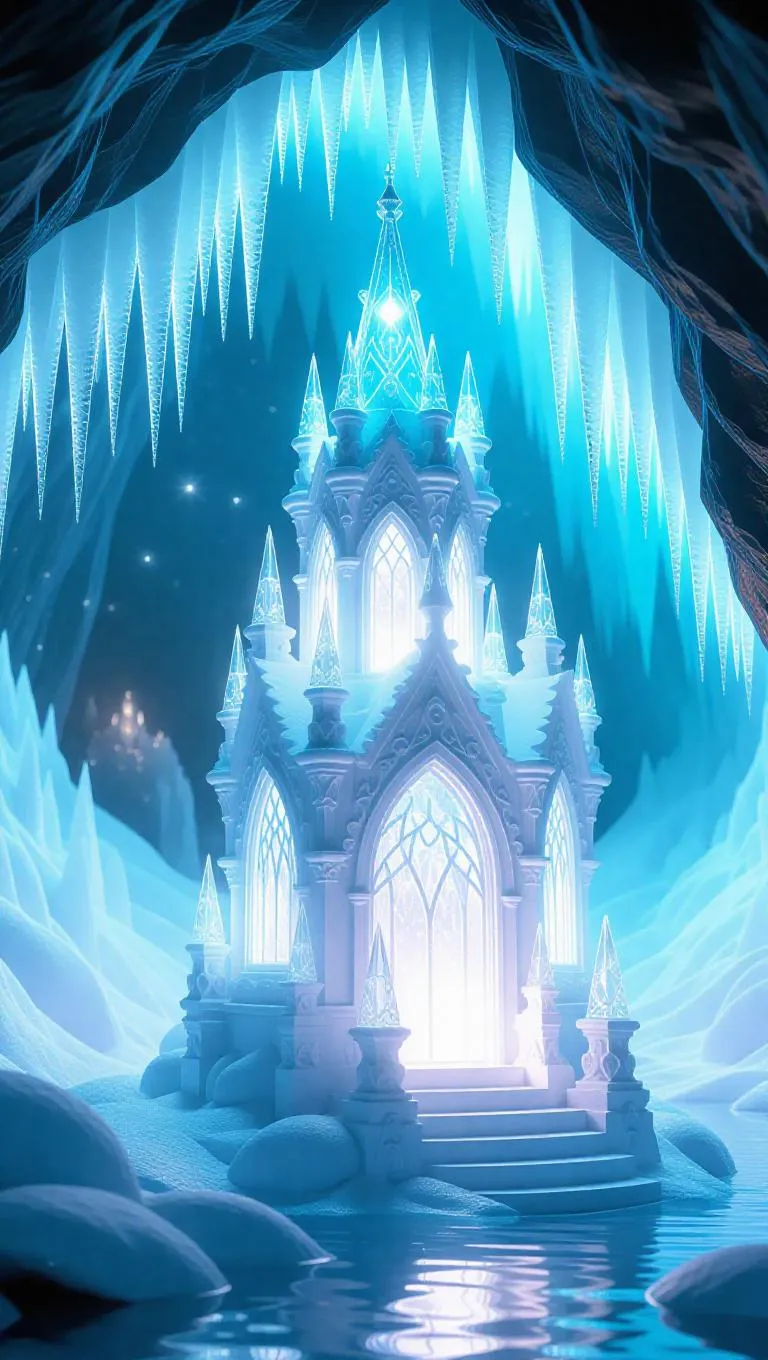 A delicate fairy tower crafted from intricately carved ice, featuring glowing crystal windows that shimmer with ethereal light, nestled in a colossal ice cave, surrounded by towering icicles and sparkling frost.