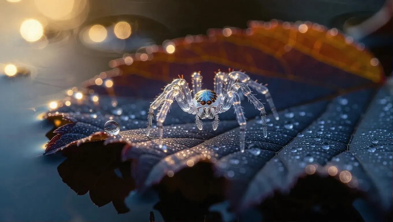 A delicate crystal spider perched on a frosted leaf, legs crafted from transparent ice with intricate, shimmering patterns, glowing softly in the gentle morning light, surrounded by dewdrops that sparkle like diamonds on the edge of a tranquil pond.