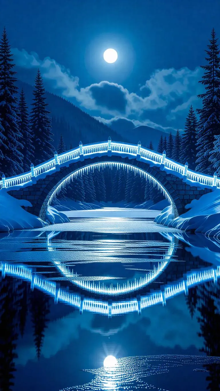 A mystical ice crystal bridge arching majestically over a tranquil frozen lake, shimmering under the bright moonlight, with delicate frost patterns adorning the ice, creating a magical winter landscape