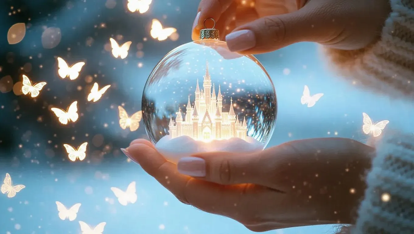 A close-up of a hand delicately placing a small, glowing snow globe, illuminated by radiating, celestial light. Inside, a miniature ice castle is crafted with mythical creatures, surrounded by a flurry of glowing butterflies, creating a magical and enchanting.