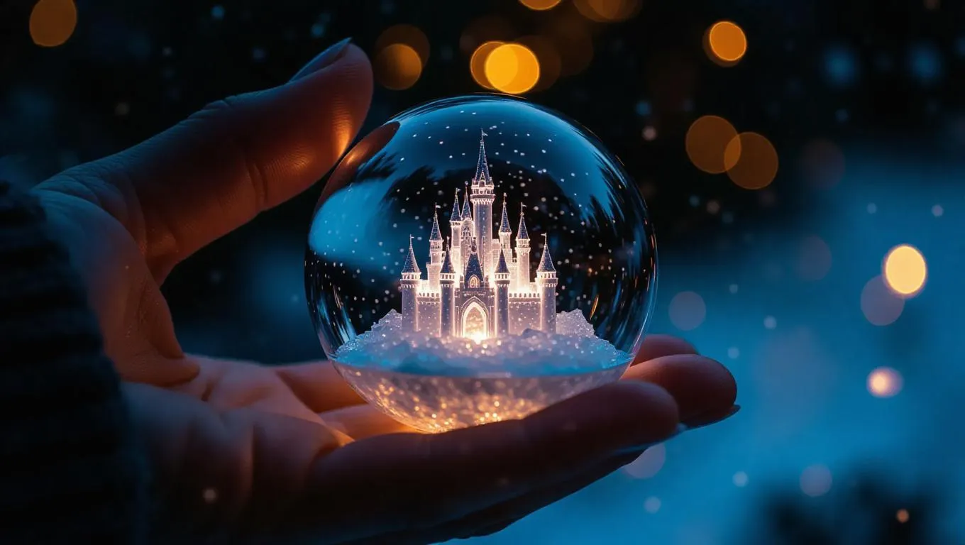 A close-up of a hand steadily isolating a small, glowing snow globe, illuminated by powerful, dynamic light. Inside, a miniature ice castle stands shattered, surrounded by a flurry of ice shards, creating a magical and enchanting.