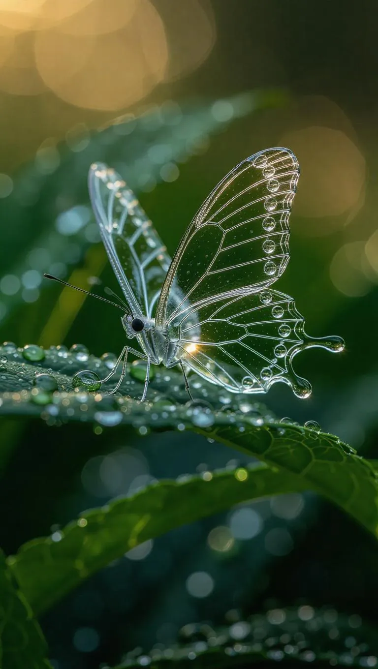 A delicate crystal butterfly perched on a vibrant green leaf, wings crafted from transparent ice with intricate, shimmering patterns, glowing softly in the gentle morning light, surrounded by dewdrops that sparkle like diamonds.