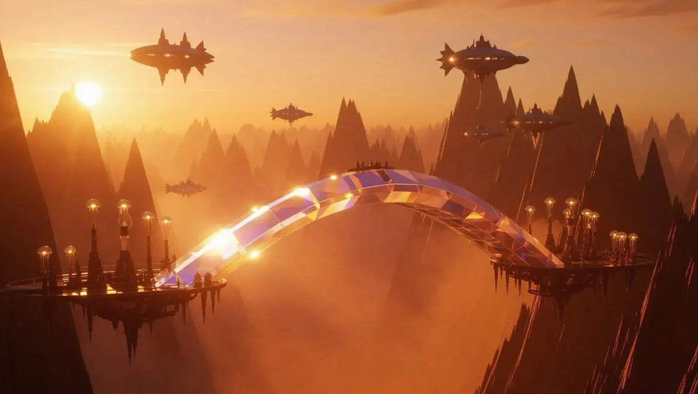 6. An iridescent crystal bridge arcs over glowing haze, linking floating islands of frosted quartz. Glass airships dock at a skyhub, while below, fiery-red lichen carpets the valley and diamond snow falls through a sun veiled in citrine clouds, as jellyfish with gold-tail comets drift by.