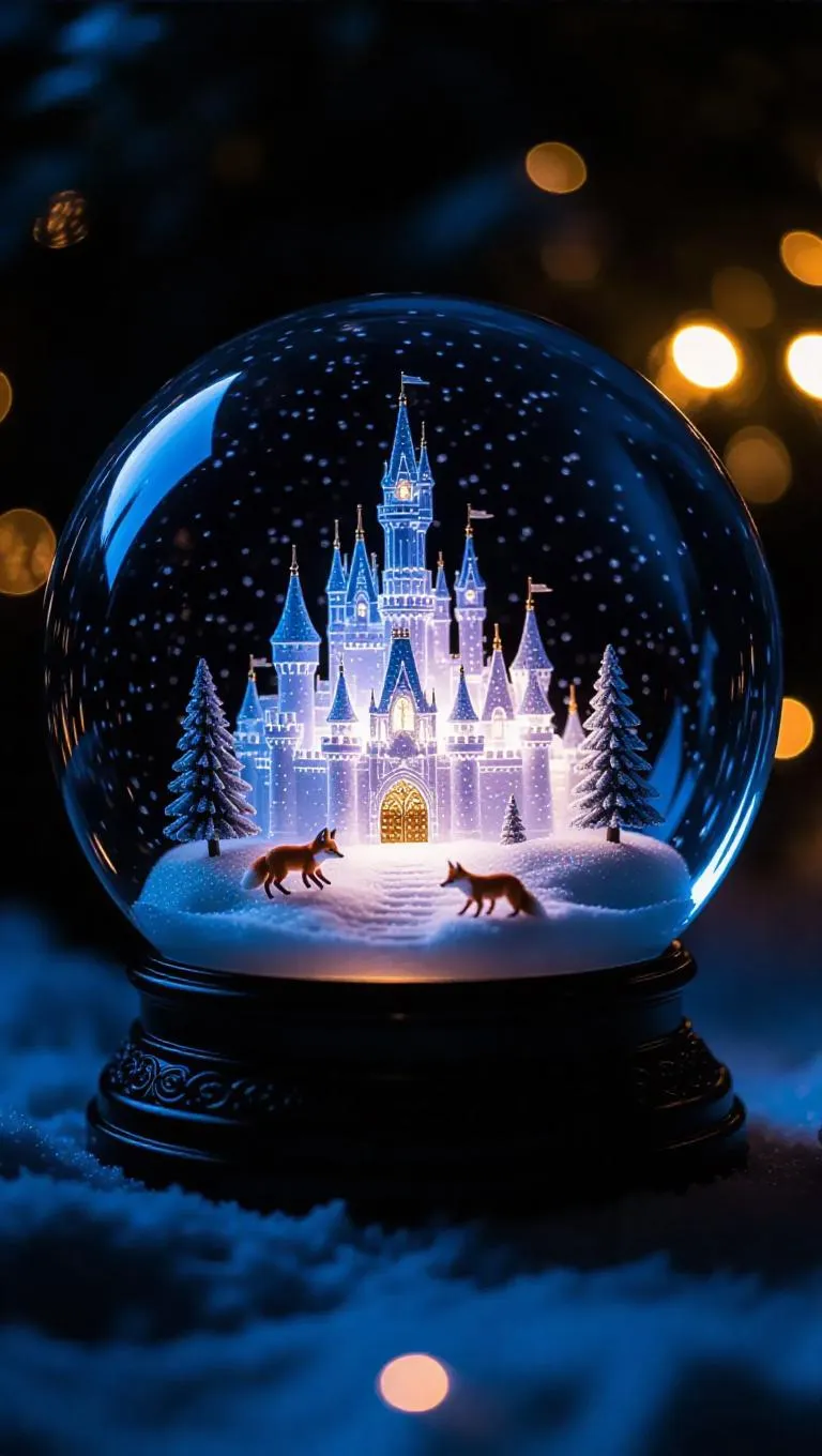 a small, glowing snow globe, illuminated by soft, ethereal light. Inside, a miniature ice castle glistens with intricate details, surrounded by a flurry of shimmering snowflakes, with a tiny fox playing in the snow, creating a magical and enchanting frost-covered landscape.