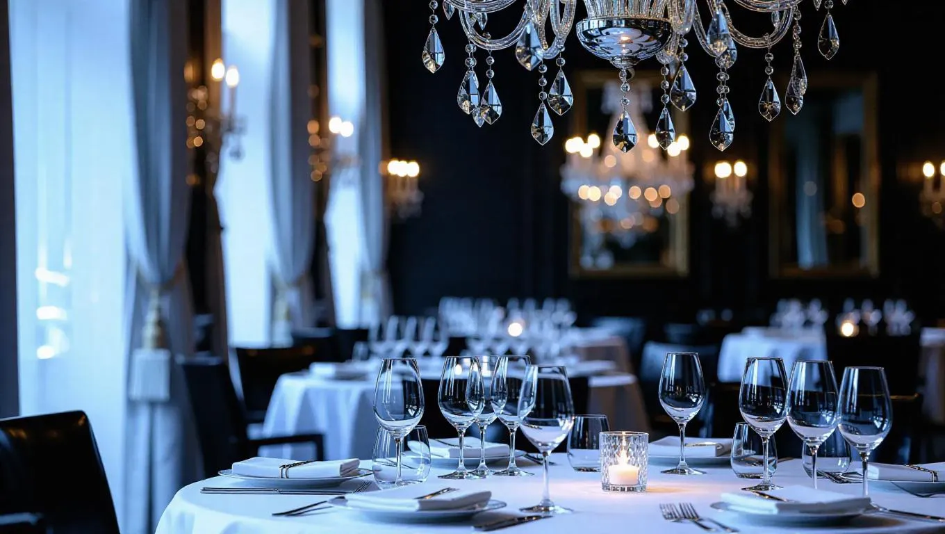 An elegant chandelier crafted entirely from shimmering ice crystals, suspended in an upscale restaurant with elegant tables and fine china, reflecting a mesmerizing array of light and shadows, creating an ethereal, frosty aura in the dining venue.