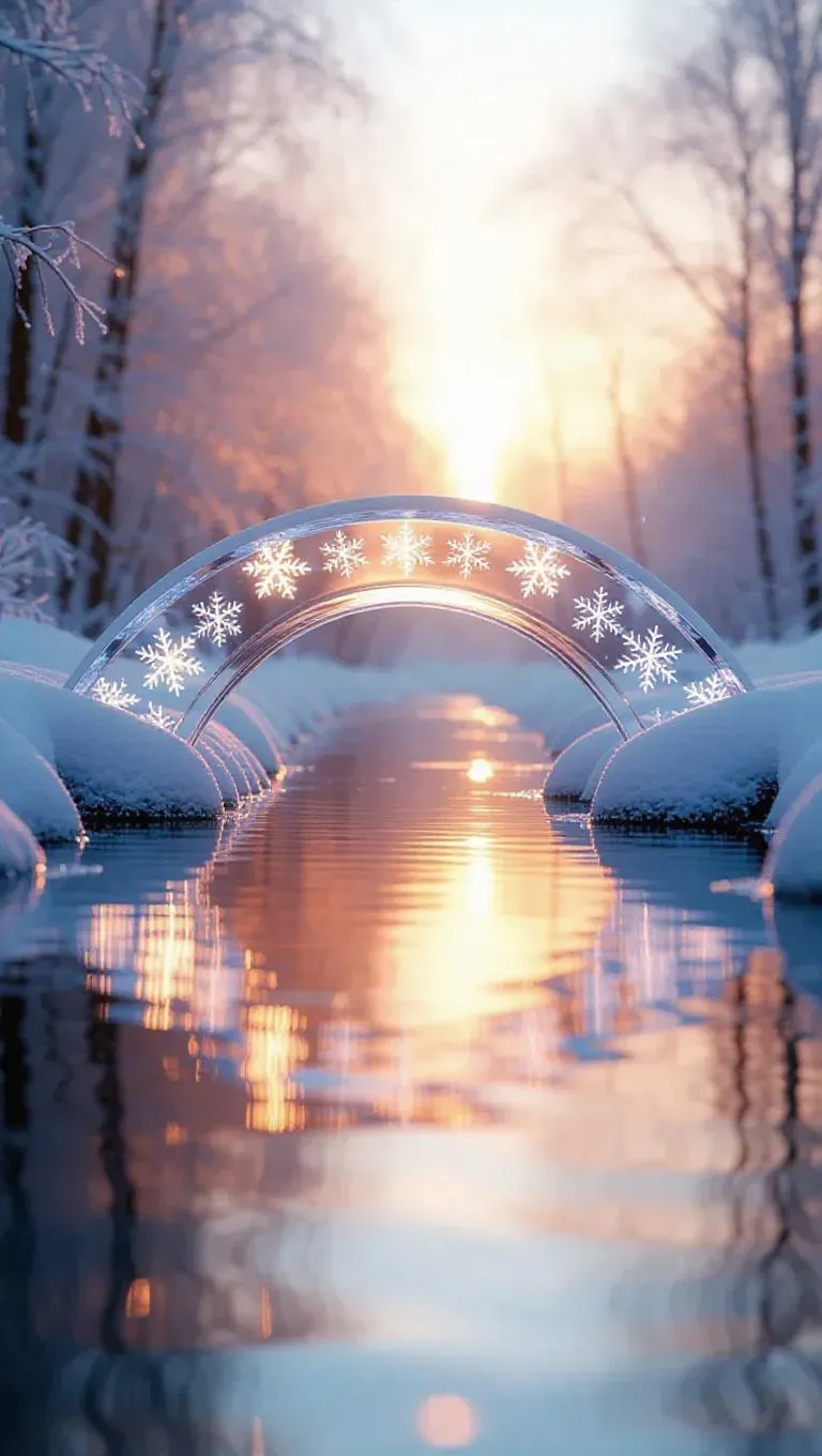 A mystical ice crystal bridge flowing over a reflective frozen river, shining under the warm sunlight, with fanciful frost patterns adorning the ice, creating a delightful winter scene