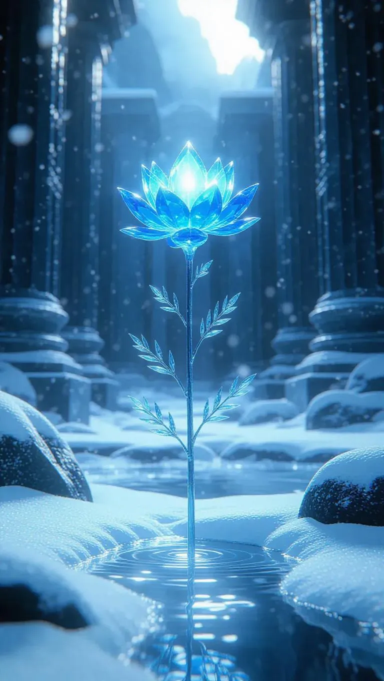 A single ethereal blue crystal flower emerging from a fissure in the icy ground, encircled by delicate, pristine snowflakes. The flower radiates a subtle glow, casting a magical aura over the frosty ruins of an ancient temple, where icy pillars rise from the snow-covered floor.