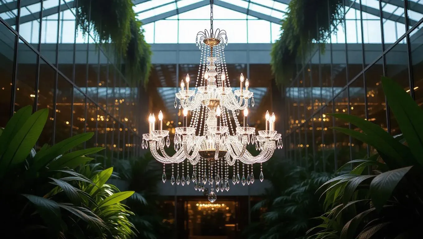 An elegant chandelier crafted entirely from shimmering ice crystals, suspended in a spacious atrium with glass walls and lush greenery, reflecting a mesmerizing array of light and shadows, creating an ethereal, frosty aura in the botanical space.