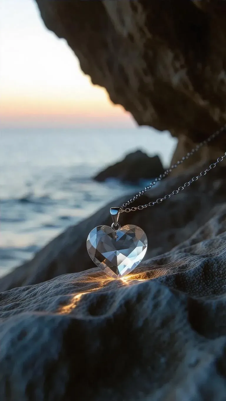 A heart-shaped crystal pendant, resting delicately on a rocky ledge, glowing faintly with an ethereal inner light, casting soft, shimmering reflections on the textured stone, surrounded by a serene, coastal cliff