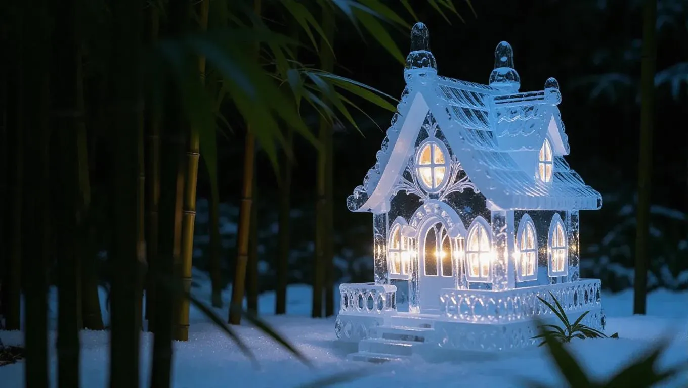 A delicate fairy house crafted from intricately carved ice, featuring glowing crystal windows that shimmer with ethereal light, nestled in a secluded bamboo grove, surrounded by tall stalks and gentle whispers