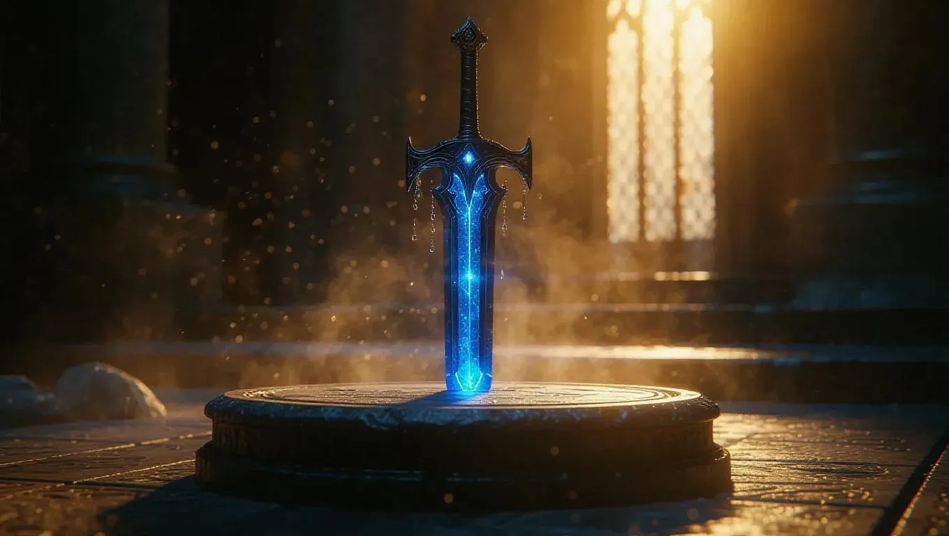 A majestic fantasy sword embedded in an ancient stone pedestal, the blade forged from pure, glowing sapphire, emitting a mesmerizing aura of blue light, surrounded by shimmering droplets and a misty, enchanted atmosphere
