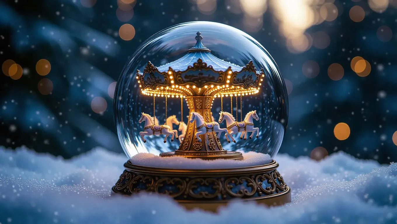 A magical snow globe encasing a spinning carousel crafted from shimmering crystal animals and twinkling icy lights, set against a frosty backdrop with swirling snowflakes, evoking a sense of enchantment and wonder