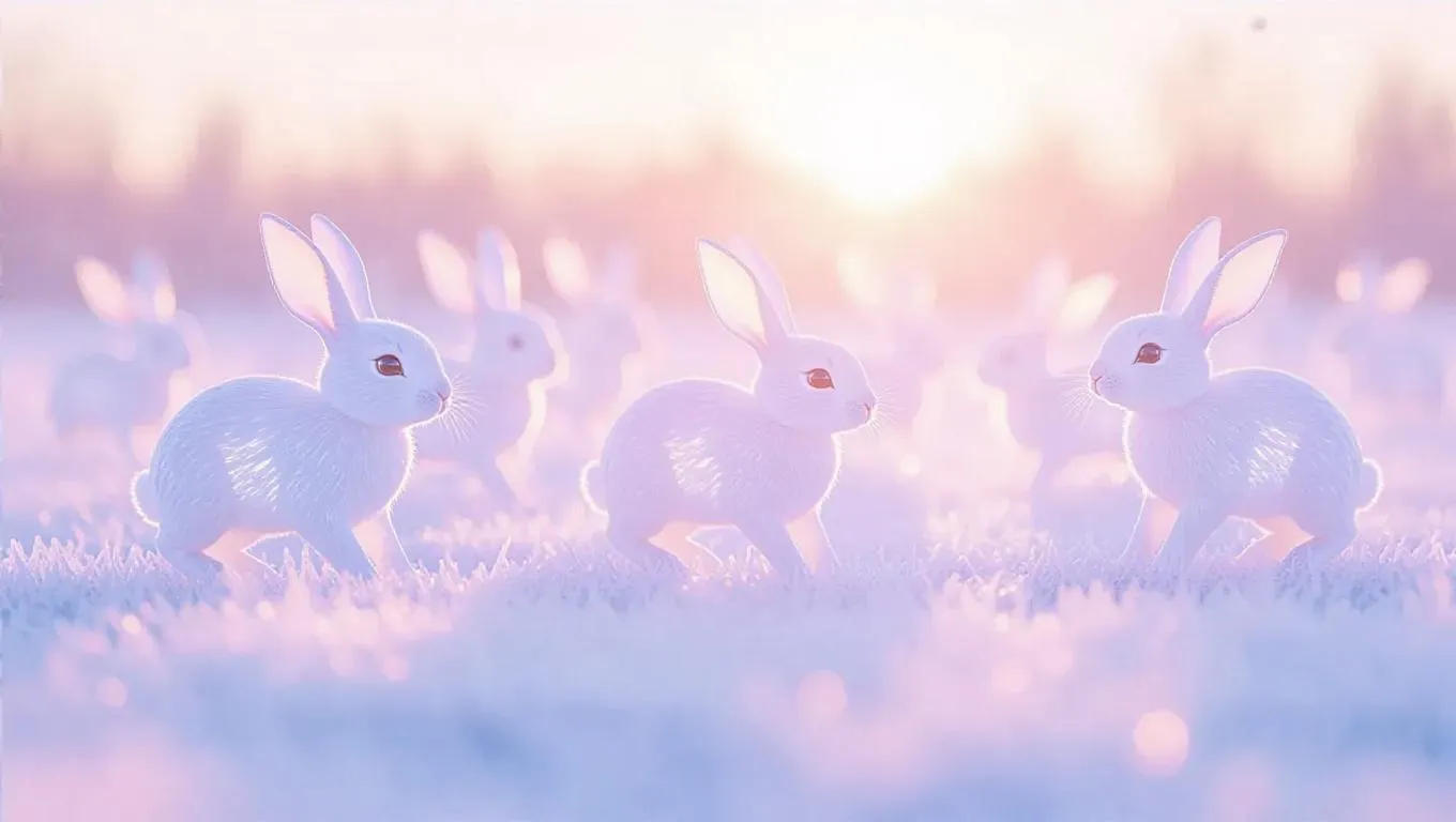 A group of ethereal crystal rabbits gracefully traversing a serene icy meadow, their translucent bodies shimmering as they catch the soft rays of the morning sun, creating a magical and frosty ambiance.