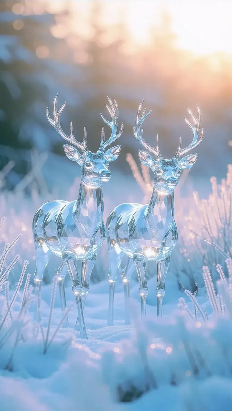 A pair of ethereal crystal deer elegantly walking through a serene icy meadow, their translucent bodies shimmering as they catch the soft rays of the evening sun, creating a magical and frosty ambiance