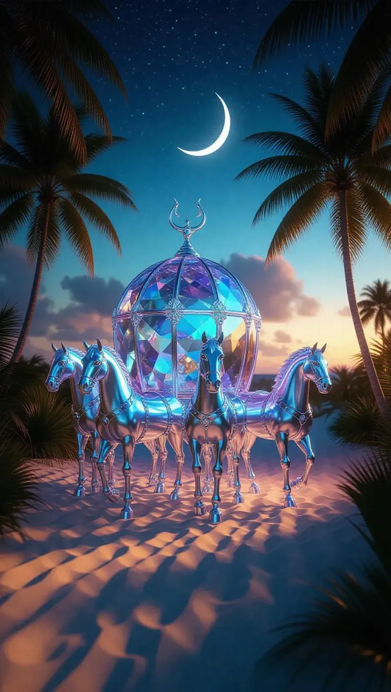 A dreamlike crystal carriage, shimmering with iridescent hues, pulled by ethereal ice horses, set on a sandy trail under a starlit sky, with palm trees and a crescent moon adding a magical glow
