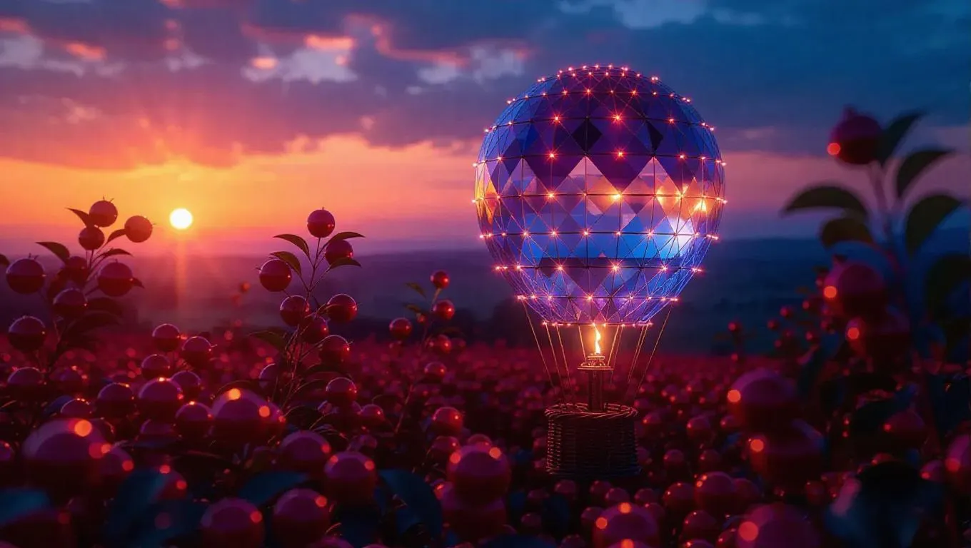 a spinning hot air balloon crafted from shimmering crystal baskets and twinkling icy lights, set against a radiant dawn sky with waking creatures, evoking a sense of anticipation and curiosity, placed in a vibrant berry patch with shining berries and a lively, fresh light.