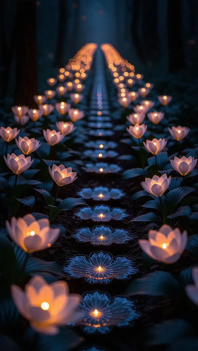 A mystical path adorned with glowing ice lilies blooming in a magical glade, petals crafted from translucent frosted crystal, casting ethereal light and shimmering hues, creating an enchanting winter wonderland