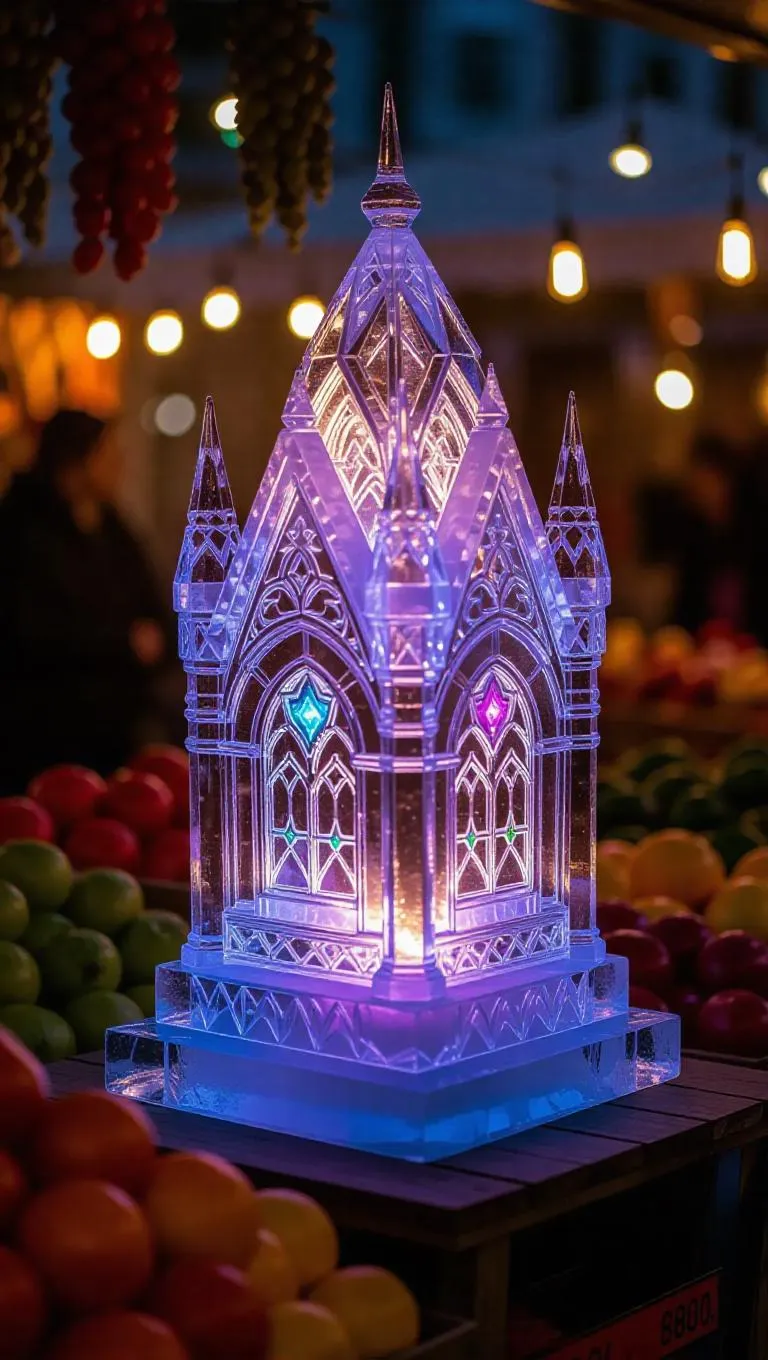 A delicate fairy monument crafted from intricately carved ice, featuring glowing crystal windows that shimmer with ethereal light, nestled in a colorful market stall, surrounded by vibrant produce and lively chatter.