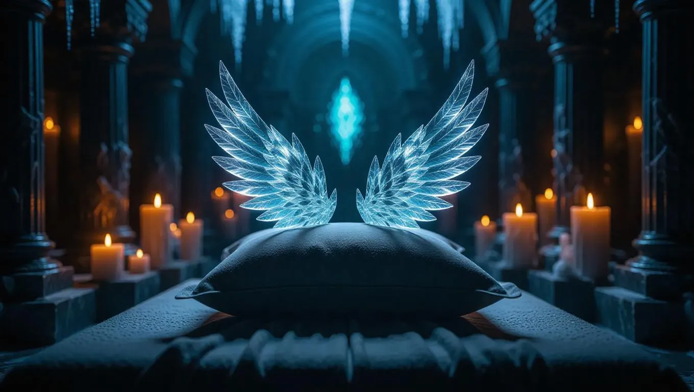 A pair of intricate ice crystal wings, gracefully displayed on a bold linen pillow in a revered icy shrine, glowing with a mystical turquoise sheen, surrounded by frost-touched columns and hanging icicles, conjuring an otherworldly and magical ambiance.
