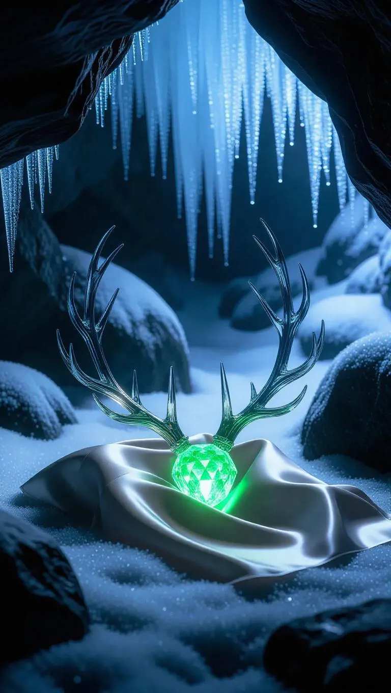 A pair of intricate crystal antlers, delicately resting on a soft silk cloth in a snowy cavern, glowing with a radiant green light, surrounded by frost-coated rocks and glistening snowflakes, creating a serene and enchanting atmosphere, set in an ancient, ice-worn cave with majestic, frozen formations and glimmering ice structures.