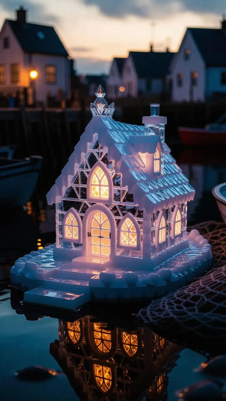 A delicate fairy house crafted from intricately carved ice, featuring glowing crystal windows that shimmer with ethereal light, nestled in a quaint fishing village, surrounded by boats and nets drying in the sun