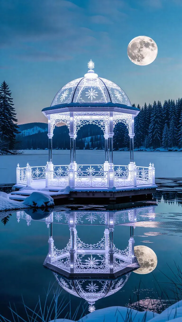 A mystical ice crystal gazebo resting gently on a glistening frozen lake, shimmering under the mellow moonlight, with ornate frost patterns adorning the ice, creating a dreamlike winter scene.