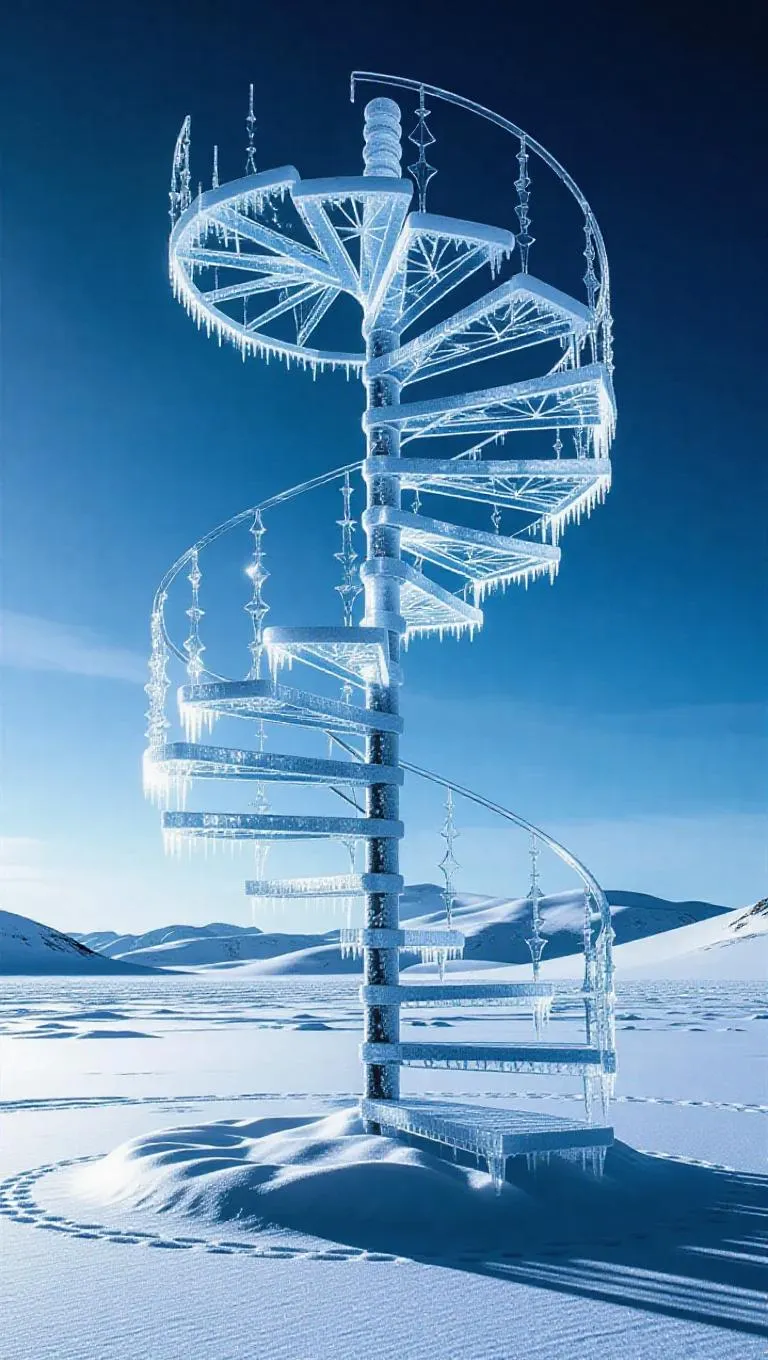 A frosty spiral staircase spins while crystallizing new frost-veined steps, each tread blooming transient ice patterns that shift with temperature. The ethereal chair emotes aurora particles, its cold glow casting timeless glacial tales across the tundra. Every blizzard snowflake carries miniature ice pavilions, while background gusts approach in perpetual slow motion yet never arrive.