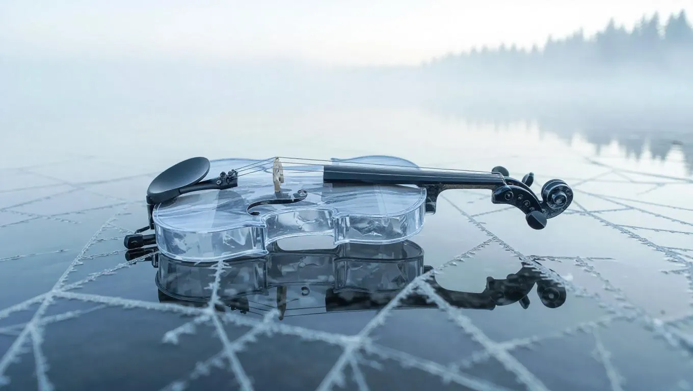 A violin hewn from crystalline ice rests lightly on a cloud of mist, its curves glinting like frozen starlight. Around it, a silent lake lies sealed in glassy ice, cracked with delicate frost patterns that spiderweb toward the shore.
