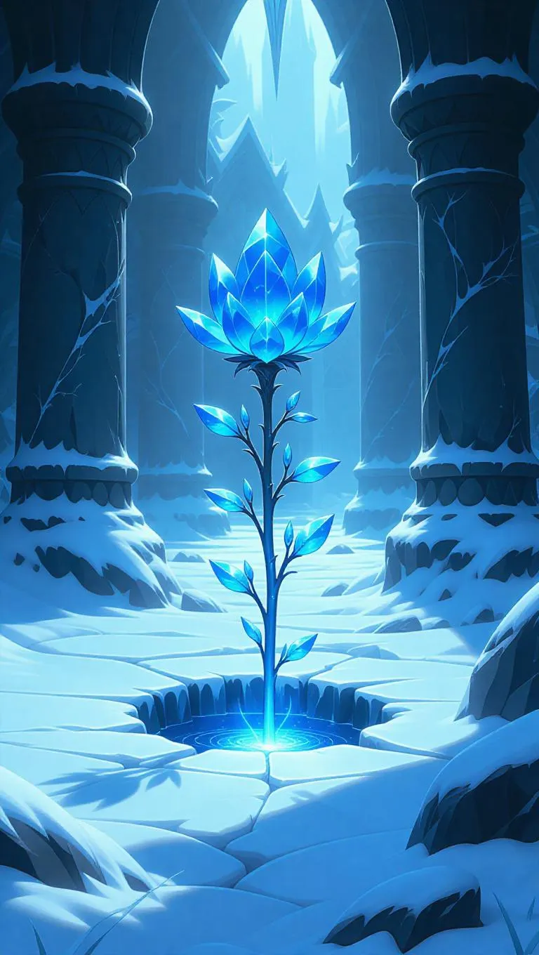 A single ethereal blue crystal flower emerging from a fissure in the icy ground, encircled by delicate, glowing vines. The flower radiates a soft glow, casting a magical aura over the frosty ruins of an enchanted temple, where icy pillars rise from the snow-covered floor.