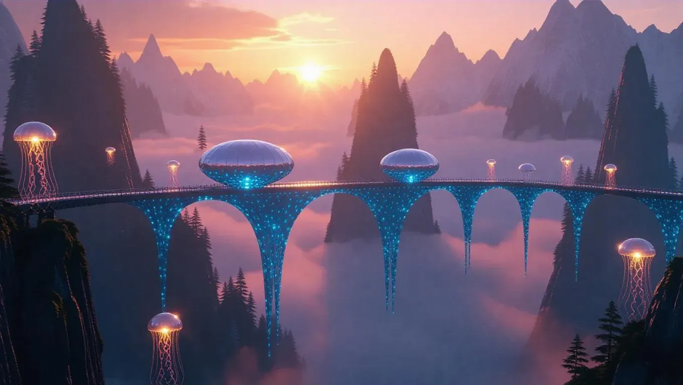 14. An iridescent crystal bridge arcs over shimmering fog, linking floating islands of frosted gems. Glass airships dock at an aerial dock, while below, stunning lichen carpets the valley and diamond snow falls through a sun veiled in peach clouds, as jellyfish with gold-tail comets drift by.