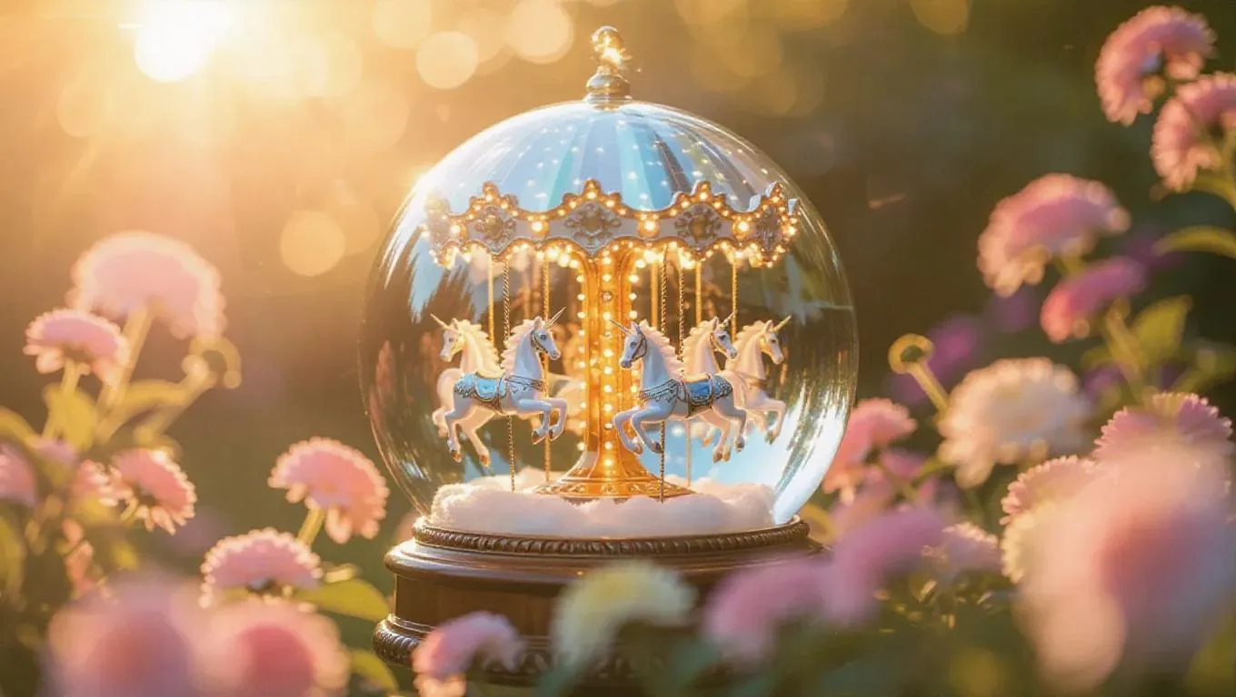 A magical snow globe encasing a spinning carousel crafted from luminous glass unicorns and glittering summer lights, set against a sunny garden backdrop with blooming flowers, evoking a sense of joy and serenity
