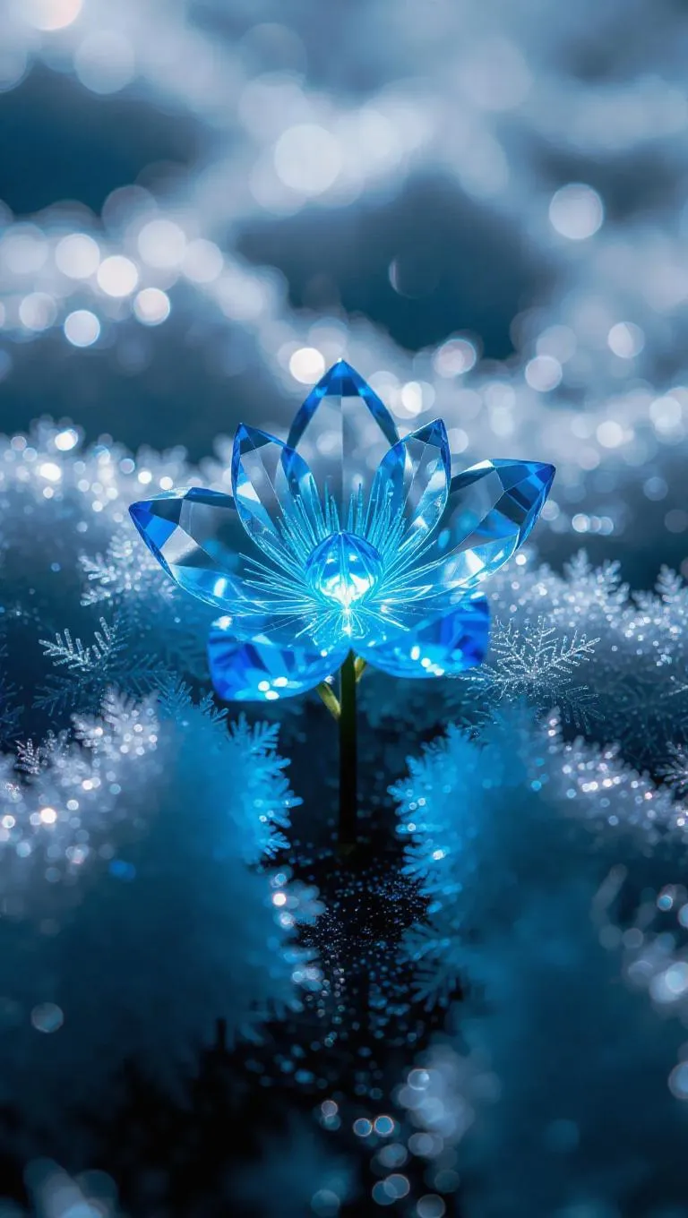 A single ethereal blue crystal flower emerging from a fissure in the icy ground, encircled by delicate, pristine snowflakes. The flower radiates a subtle glow, casting a magical aura over the frosty landscape