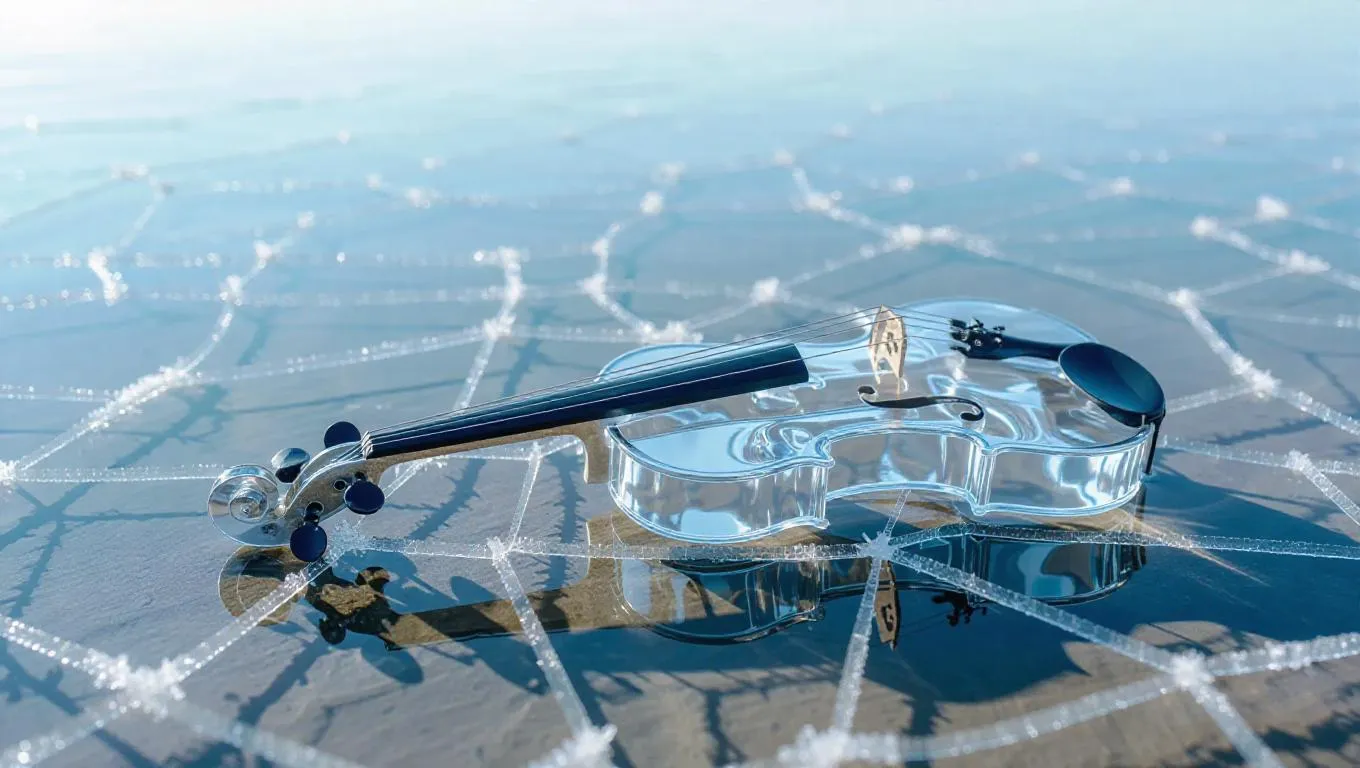 A violin hewn from crystalline ice rests lightly on a sandy beach, its curves glinting like frozen starlight. Around it, a silent lake lies sealed in glassy ice, cracked with delicate frost patterns that spiderweb toward the shore.