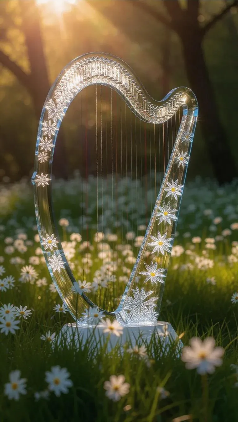 A mystical ice crystal harp arching gracefully over a lush green meadow, shimmering under the bright afternoon light, with ethereal flower patterns blooming around, creating a spellbinding spring landscape.
