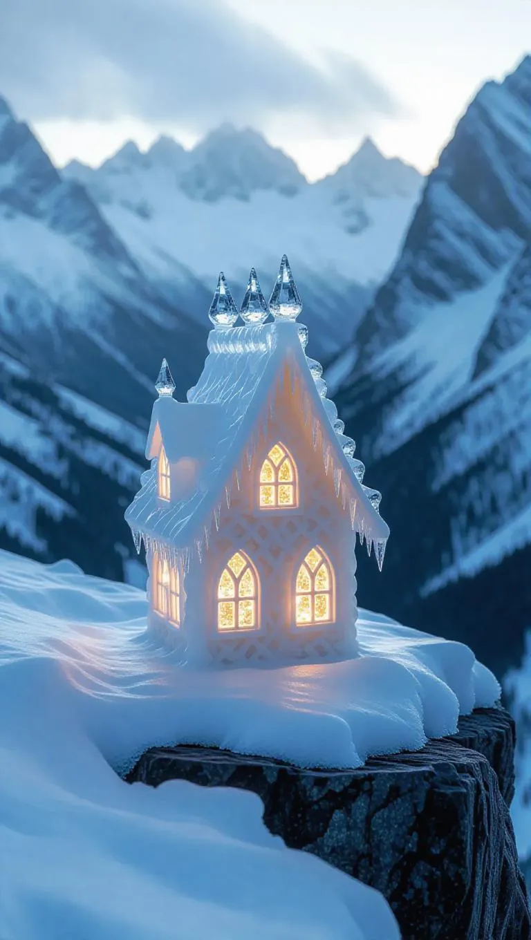 A delicate fairy house crafted from intricately carved ice, featuring glowing crystal windows that shimmer with ethereal light, nestled in a dramatic mountain pass, surrounded by towering peaks and chilling winds