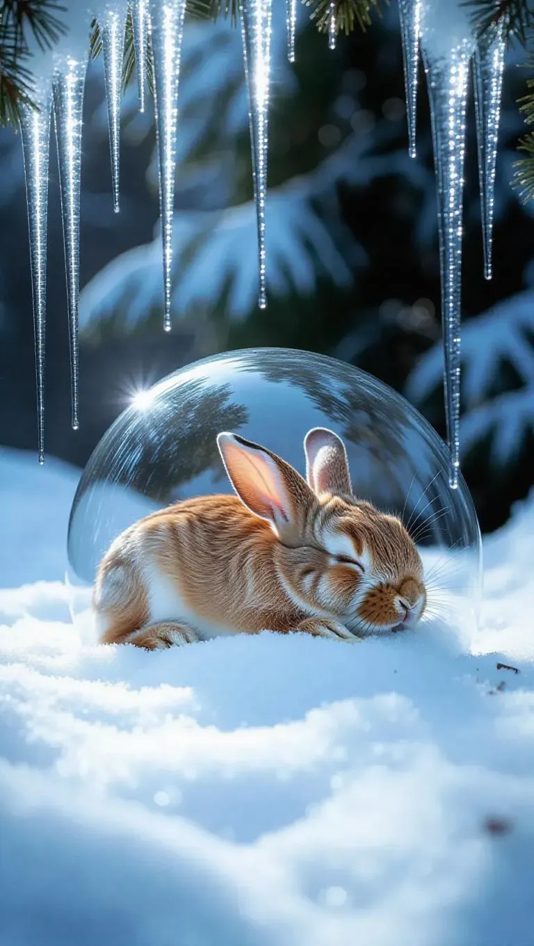 A sleeping rabbit curled inside a translucent crystal dome, surrounded by glistening icicles and deep, fluffy snow, creating a magical, winter wonderland atmosphere in a frosty meadow.