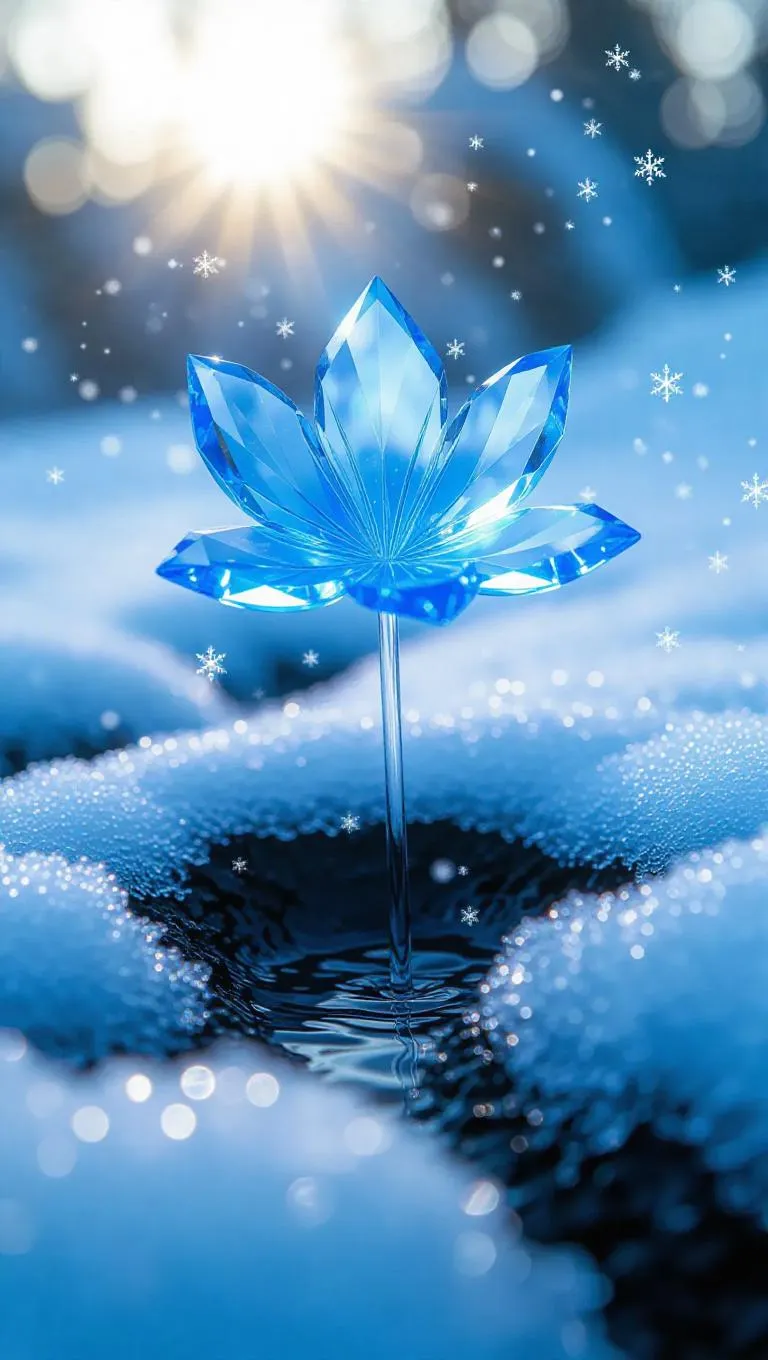 A single ethereal blue crystal flower emerging from a fissure in the icy ground, encircled by delicate, luminous snowflakes. The flower radiates a subtle glow, casting a magical aura over the wintry landscape