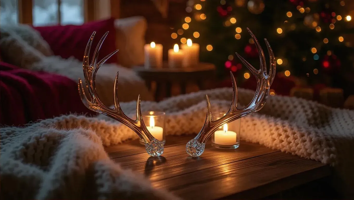 A pair of intricate crystal antlers, beautifully displayed on an antique wooden table in a winter retreat, glowing with a rich burgundy light, surrounded by cozy blankets and glimmering candles, creating a warm and nostalgic atmosphere, set in a charming, rustic hideaway with ice-laden decor and inviting warmth.