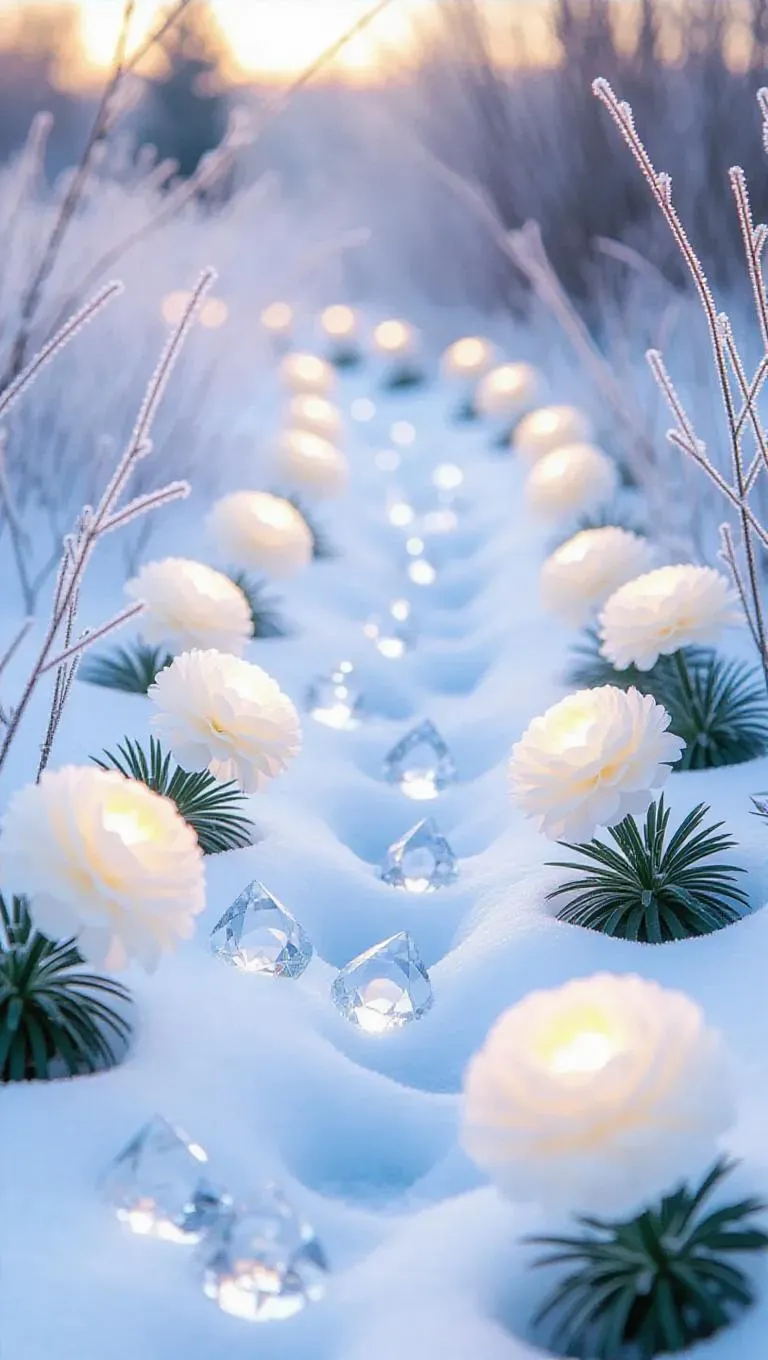 A mystical path adorned with glowing ice marigolds blooming in the snow, petals crafted from sparkling frosted crystal, casting bright light and shimmering hues, creating an enchanting winter wonderland in a tranquil frosty outcrop.