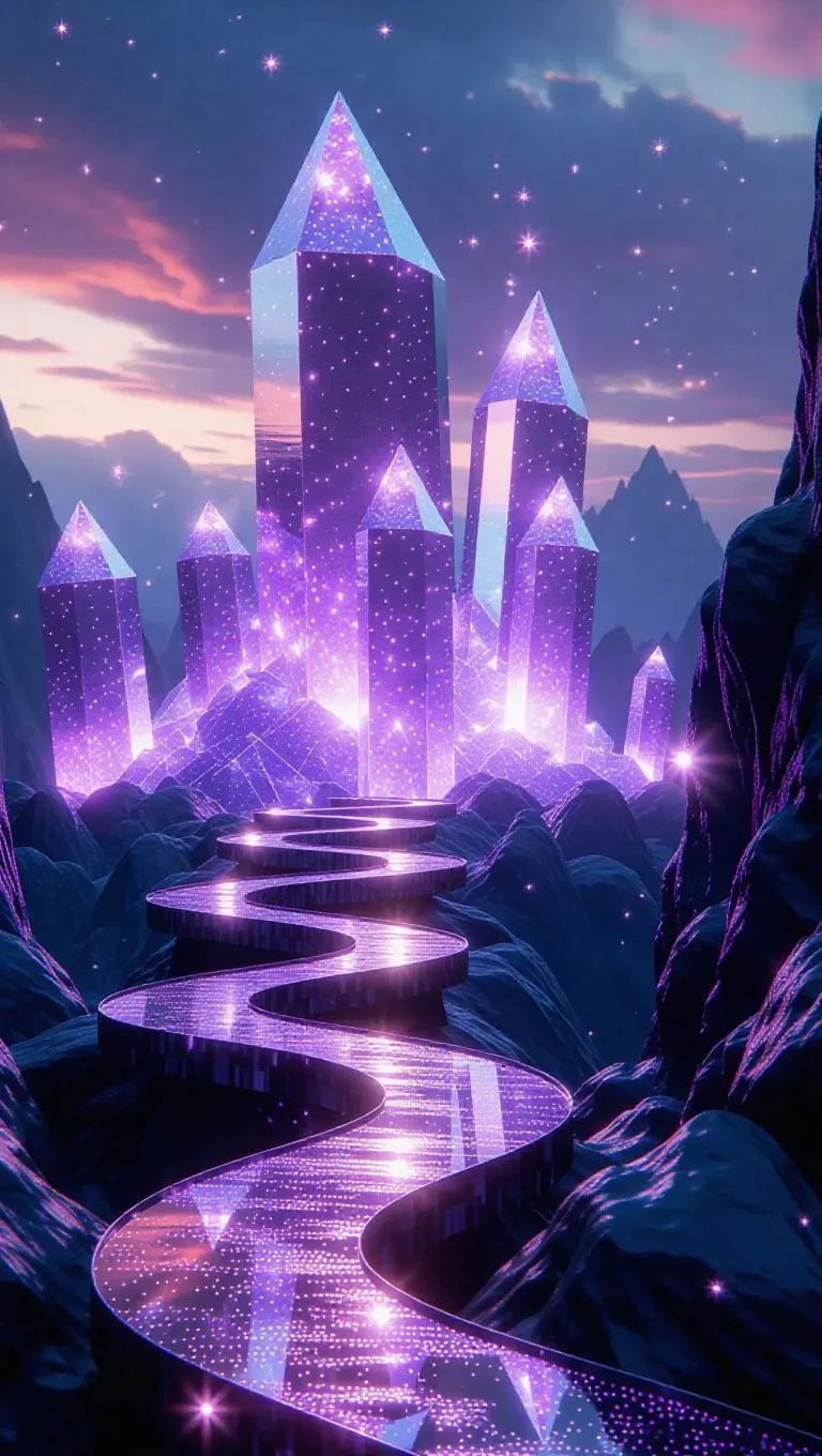 A panorama of elevated crystal platforms floats above an expansive, glittering gem landscape, where a sleepy titan of crystal and cosmic dust lies, its scales embellished with starry constellations—while above, crystal-buds swirl like radiant prisms in a wind that whispers through prisms, creating a tranquil and ethereal vibe in this crystalline world.