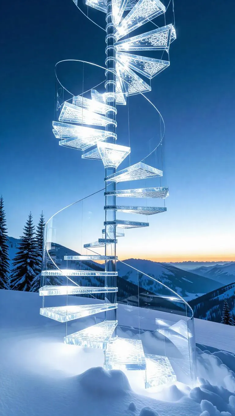 A spiraling staircase crafted from frosted glass and shimmering fire crystals, ascending into a vast, snowy sky, illuminated by soft, ethereal light, creating a magical and otherworldly atmosphere
