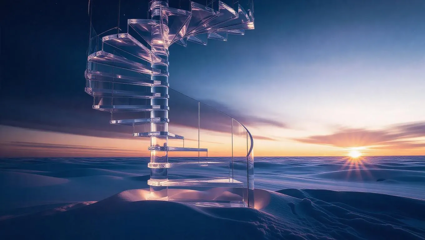 A spiraling staircase crafted from frosted glass and shimmering ice crystals, descending into a vast, snowy sky, illuminated by soft, ethereal light, creating a magical and otherworldly atmosphere