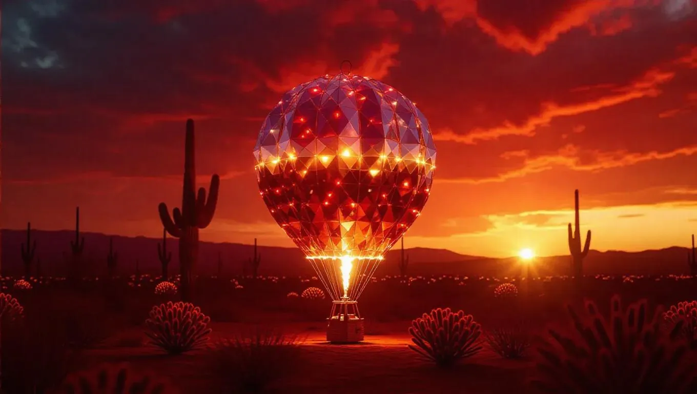 a spinning hot air balloon crafted from shimmering crystal baskets and twinkling icy lights, set against a fiery red sunset with swirling winds, evoking a sense of passion and energy, placed in an open desert with glowing cacti and a warm, golden light.