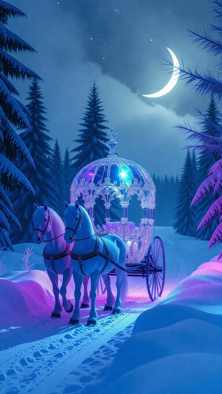 A dreamlike crystal carriage, shimmering with iridescent hues, pulled by ethereal ice horses, set on a snowy trail under a foggy sky, with frosty trees and a crescent moon adding a magical glow