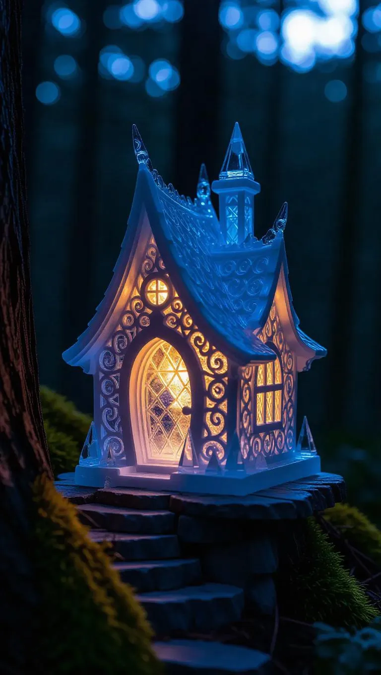 A delicate fairy house crafted from intricately carved ice, featuring glowing crystal windows that shimmer with ethereal light, nestled in a shadowy moonlit grove, surrounded by ancient trees and whispering winds